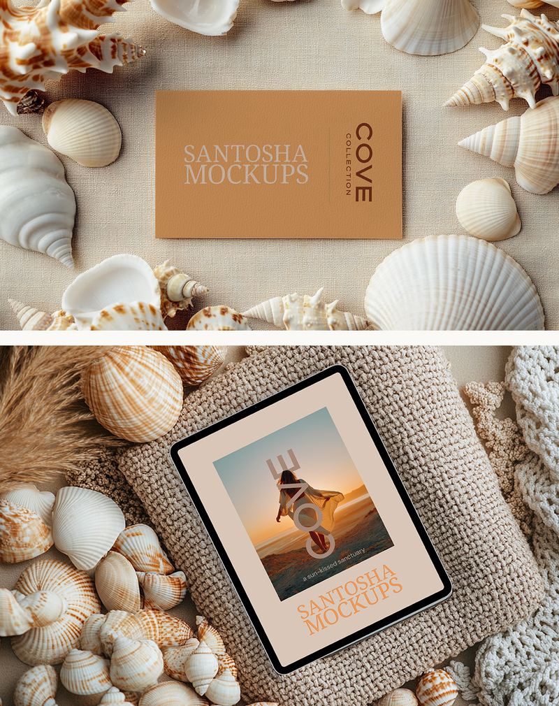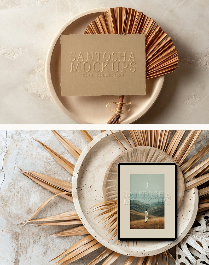 Our mockups are designed for anyone who wants to showcase their work in an elevated light. They are more than backdrops; they are intentional stages that amplify your creativity, allowing your vision to step forward with polish, clarity, and quiet confidence. We believe the best design happens when there’s no forcing, no chasing trends — just refined aesthetics, thoughtful styling, and a quiet kind of strength. Each suite draws inspiration from natural textures, sculptural forms, and soft light, creating visual spaces that feel both grounded and expansive. Studio Santosha exists as a creative sanctuary — a place where your work can breathe, expand, and be seen at its best. Every collection is a tool, yes, but more than that, it’s an invitation: to create with intention, to present with presence, and to let your designs speak with elegance and ease.