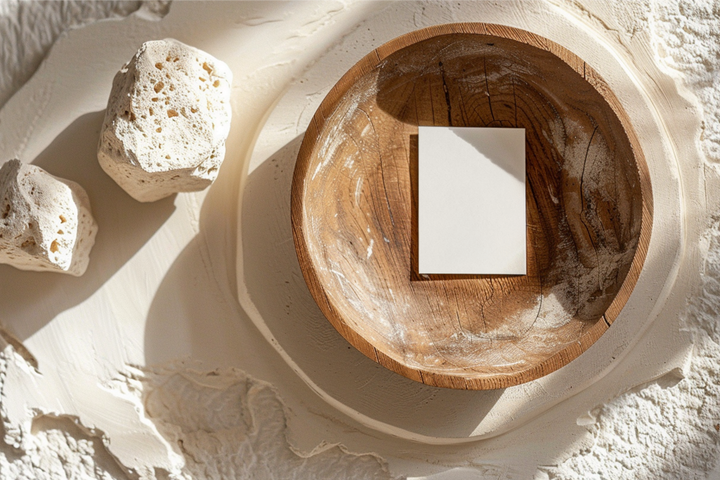 Raw, grounded, and sunlit. Earth Cradle features a vertical business card resting inside a rustic timber bowl, dusted with natural powder and encircled by textured plaster and porous stone. Light moves across the scene in sharp contrast, casting bold lines and layered shadows that give the image dimensional strength.
