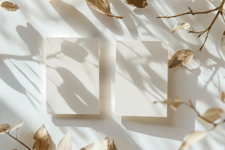 Two vertical business cards sit in quiet symmetry, their surfaces touched by the shifting shadows of dried foliage. Form & Fade balances the graphic clarity of clean design with the softness of organic movement — where structure meets impermanence in a play of light and air.