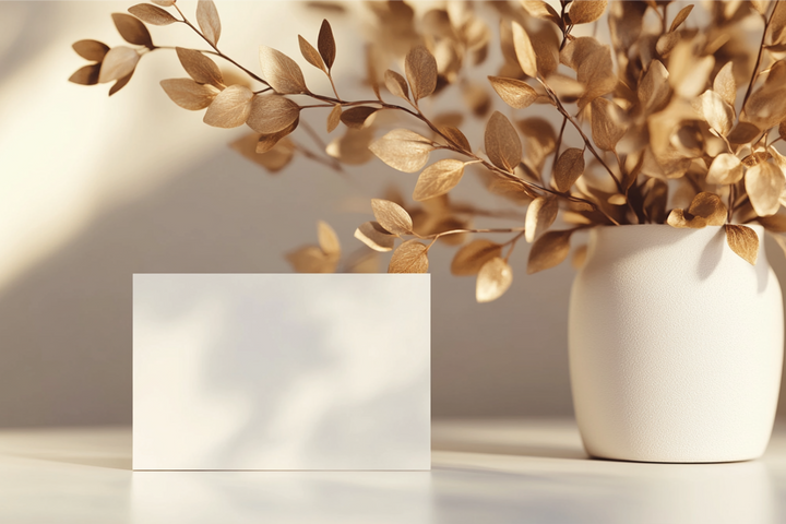 A horizontal business card rests in stillness, framed by softly blurred botanicals and sunlit shadows. The matte ceramic vase and golden branch styling invite warmth without distraction — creating a setting that feels both elevated and grounded. Light falls across the scene in gentle movement, offering depth, softness, and subtle contrast.