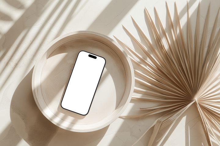 An iPhone rests in a pale timber bowl, bathed in soft natural light and surrounded by sculptural palm. Light Essence is a masterclass in visual restraint — where material simplicity, gentle contrast, and spatial clarity converge to create a scene that feels effortlessly elevated.
