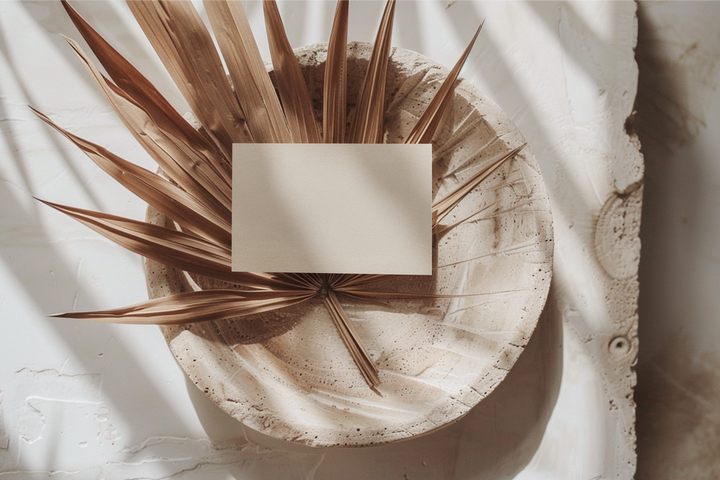 A horizontal business card is softly framed by a sculptural palm frond, resting within a textured travertine bowl. Palm Trace is a meditation in form and tone — dried botanical lines, natural curvature, and sunlit texture brought together in quiet harmony.