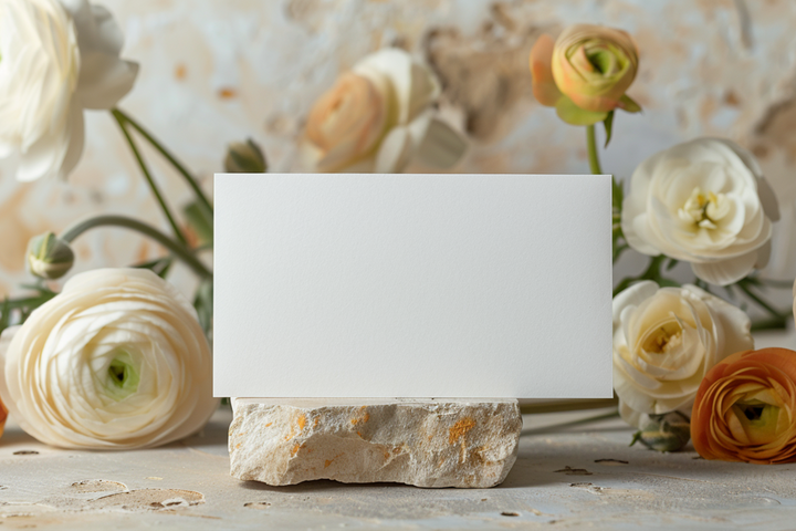 Where softness meets structure. Petal Stone offers a sculptural frame grounded in nature — a premium card balanced on sun-washed limestone, framed by blooming ranunculus in cream, apricot, and soft peach. The scene is styled with depth and contrast: raw stone texture, delicate florals, and a painterly backdrop that adds a subtle richness to the composition.