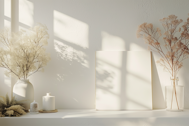 A modern frame softened by nature. Pressed Light brings digital clarity into conversation with wild florals — a curated arrangement of fresh-cut stems surrounding a centred tablet screen. The creamy backdrop and warm tones lend a gentle presence, while the florals add movement, colour, and a sense of tender spontaneity.