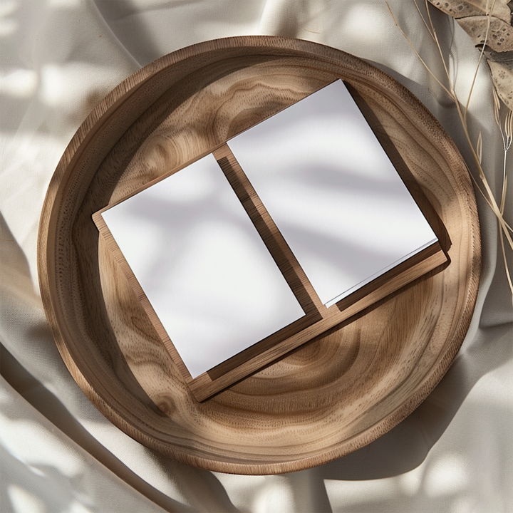 Two vertical business cards rest side by side atop a handcrafted wooden holder, nestled within a shallow timber bowl and softly lit through sculptural shadows. Soft Stack balances form and function — layered, grounded, and intentional. The scene is all about rhythm: organic grain, curved contours, and diffused light on textured linen.