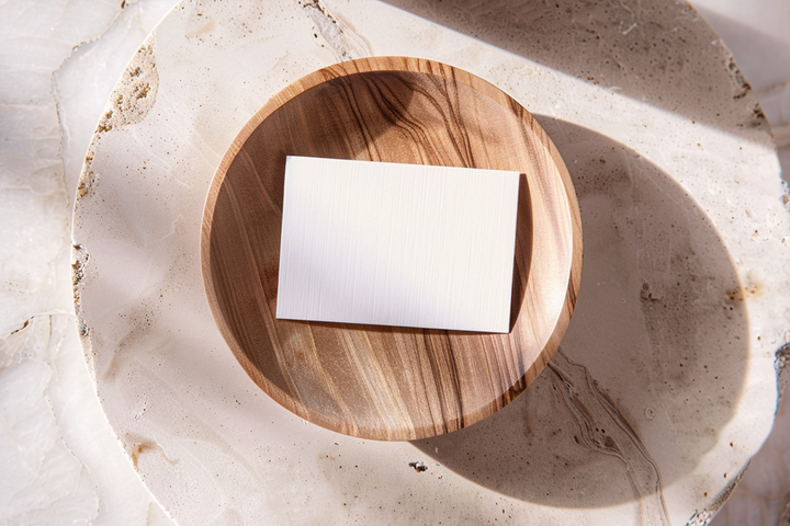 Crafted light meets quiet materiality. Sunform captures a landscape business card nestled in a carved timber dish, its clean surface illuminated by sweeping shadows and sun-warmed textures. The stone beneath adds sculptural depth — organic, imperfect, and beautifully grounded.